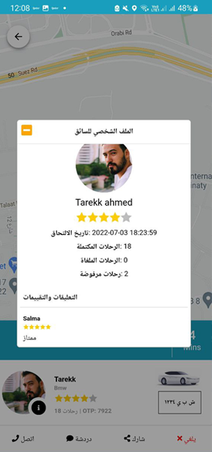 يمكن للعميل الحصول على تفاصيل إضافية حول السائق المعين له ، مثل وقت انضمام السائق إلى الخدمة ، وعدد الرحلة المكتملة ، بالإضافة إلى تعليقات وتصنيفات السائق من قبل الركاب الآخرين.